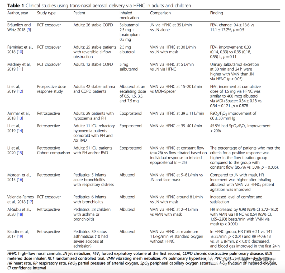 HFNC雾化吸入治疗在儿科患者中的应用逐渐增加,但其临床疗效也受到了质疑。表1总结了目前有关采用 HFNC雾化吸入治疗的临床证据 (1)