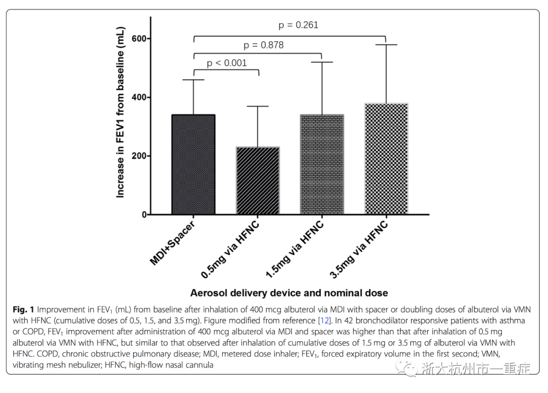 在美国和欧洲,沙丁胺醇溶液的标签剂量为2.5 mgLi等对42名哮喘或 COPD稳定期患者进行了量效关系分析。已知,上述患者经定量雾化吸入器(MDI)联合雾化助吸器 (SPACER)吸入400 mcg沙丁胺醇有反应。受试者经1520 L/min气流量的 HFNC联合 VMN吸入沙丁胺醇的剂量逐渐递增。当沙丁胺醇累积剂量达1.5mg时,HFNC联合 VMNFEV1的改善效果与 MDI联合 SPACER相当 (P=0.878) (1)