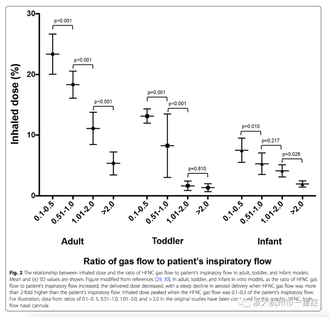 两项体外研究显示,对于呼吸困难的成人患者,当HFNC的气流量从50 L/min降至30 L/min时,吸入的气溶胶量随之增加;但当气流量降至10 L/min时,吸入的气溶胶量反而下降。当HFNC的气流量为30~50 L/min时,与平静呼吸患者相比,呼吸困难患者吸入的气溶胶量更大;而气流量为10 L/min时则不会如此。随后,Li等报告发现,患者的吸气流速比设定的 HFNC气流量更为重要。与设定的高气流量相比,HFNC的气流量小于患者的吸气流速时,吸入的气溶胶量更多;当 HFNC气流量设定在患者吸气流速50%的时候,其气溶胶量较为恒定。这一结果与婴儿和儿童的数据一致 (2)