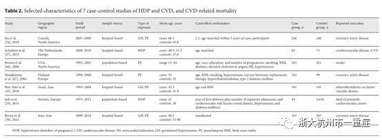 表2显示了2004年至2019年发表的7项病例对照研究的特点,样本量从158至3678名妇女之间进行。研究人群来自欧洲(n=3)、北美(n=3)和亚洲(n=1)。参与者的年龄从15岁到66岁不等。样本来源方面,2项研究基于人群,5项研究基于医院。有6项研究进行了调整和配对。