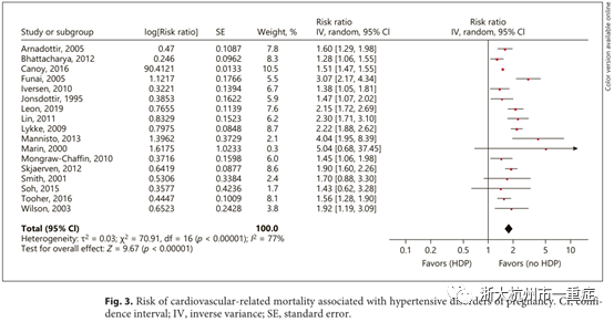 图3总结了与HDP相关的心血管疾病相关死亡率的风险估计。纳入研究中报告的关联度RR在1.28-5.04之间。综合这些风险评估的Meta分析得出总RR为1.78(95%CI为1.58-2.00),具有显著的异质性(I2=77%,p<0.001)。
