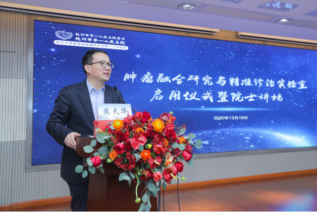 浙江大学副校长、医学院党委书记周天华指出,当今世界正经历百年未有之大变局,新冠肺炎疫情全球大流行使这一大变局加速演变,党的十九届五中全会把保障人民健康放在优先发展的战略位置,这充分体现了以人民为中心的发展思想,必将对我国卫生健康事业发展、增进人民健康福祉产生深远的影响。浙江大学努力在大变局中掌握战略主动,在大挑战中用好战略机遇,打造医学高峰,实现医学“学科造峰”。作为国内高校科技创新的主力军,浙江大学主动面向人民生命健康,积极对接国家健康的战略需求,于今年1月正式成立浙江大学癌症研究院,奋斗打造国际一流的高水平癌症医学创新高地,今天,市一医院实验室的启用与浙江大学肿瘤学科布局与战略发展是高度契合的,必将成为浙大医学学科造峰的重要力量。最后,周天华希望实验室能提高站位、以开阔的视野、以创新为核心,做好肿瘤研究和前沿技术联动,将实验室打造成市一医院和浙江大学的“金名片”。