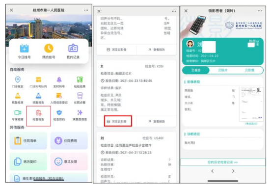 4、点击“检查报告”,患者可在检查报告列表查询最近一年内的检查报告,点击“浏览云影像”可以直接查看云影像。