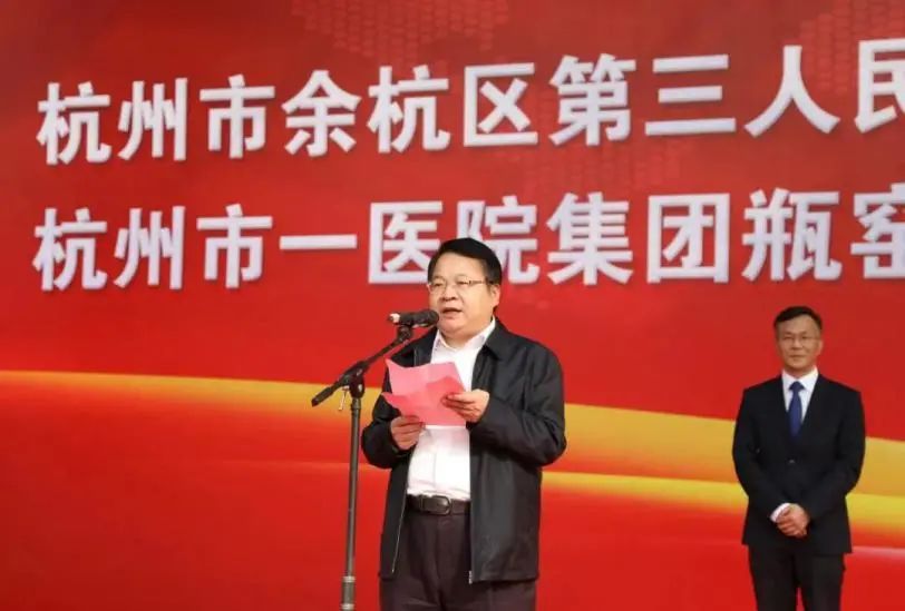 余杭区区委副书记、区长陈如根作重要讲话。他强调余杭区委区政府坚决贯彻以人民为中心的发展理念,把健康余杭建设作为民生领域的重要工作,大力推进医疗卫生体制改革和卫生健康领域重点项目建设。今天,新院区的启用必将是市一医院瓶窑院区(余杭三院)发展史上的里程碑,希望余杭三院能珍惜机遇,最大程度改善余杭西部人民群众的就医条件,带动全区医疗卫生事业建设再上新台阶。
