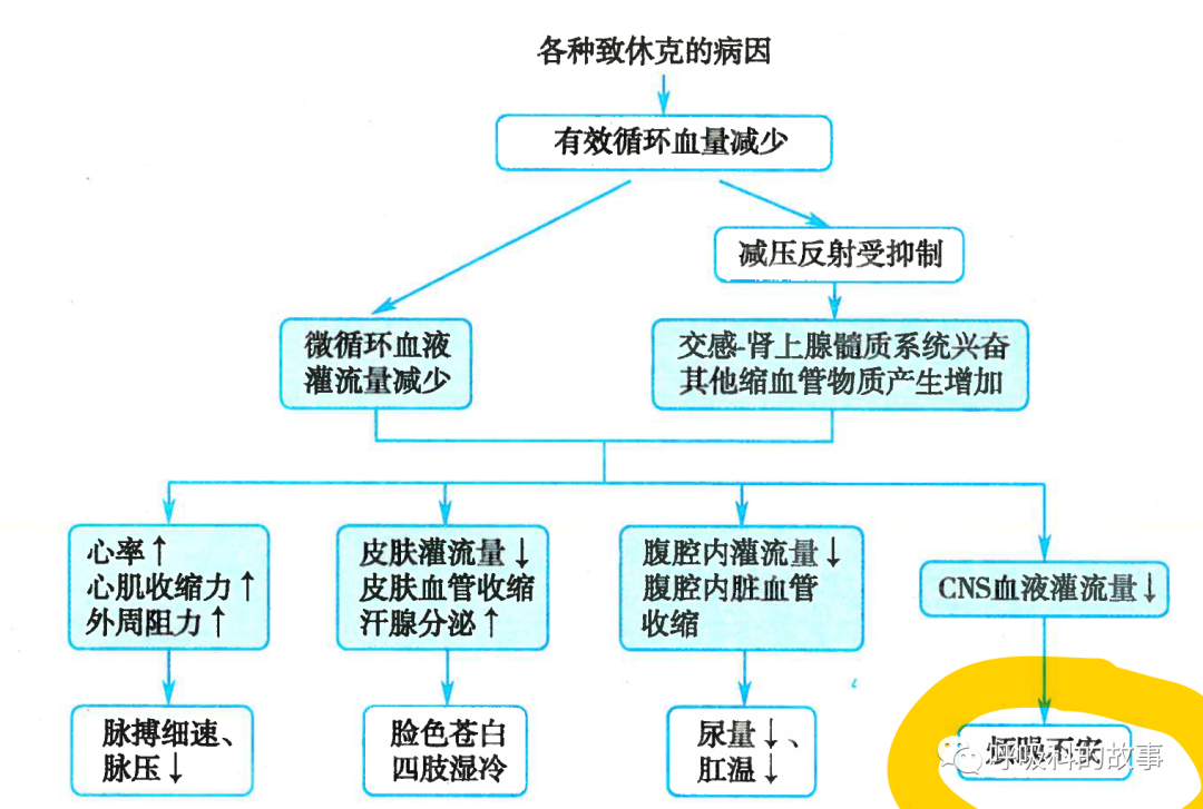 上图 休克早期微循环缺血期由于脑部血流灌注减少会出现烦躁不安。