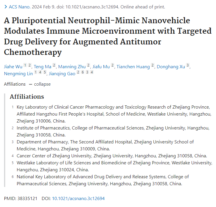 ACS Nano | 成人抖音 林能明教授团队和浙江大学高建青教授团队揭示仿中性粒细胞纳米载体调节免疫微环境增敏抗肿瘤化疗疗效的作用机制